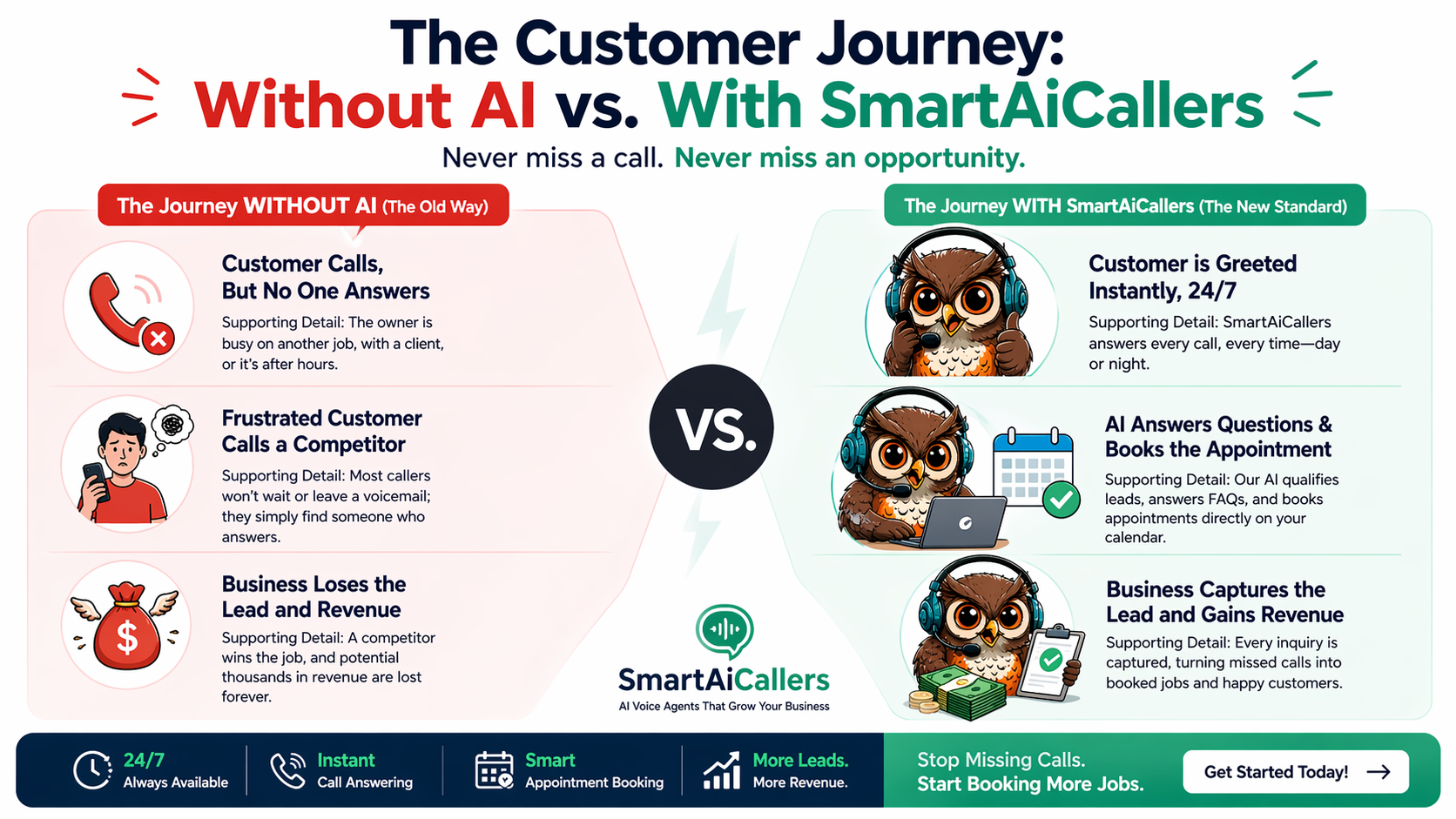 Answer every call, book more jobs, and never miss a customer again. Your AI works 24/7 so you don't have to.